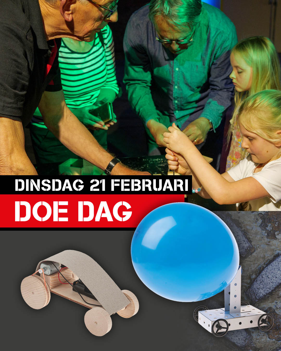 Tijdens de voorjaarsvakantie hebben we op zaterdag 21 februari weer een leuke extra doe-activiteit voor kinderen. In ons laboratorium kunnen alle kinderen aan de slag met een knutselproject. Tegen betaling van 1 euro extra op de reguliere entreeprijs mogen ze een autootje knutselen en natuurlijk daarna ook uittesten. Kinderen vanaf 8 jaar maken een electrisch aangedreven autootje. Voor kinderen onder de 8 hebben we een knutselproject met een ballonautootje. Beide autootjes kunnen dus zelf rijden.