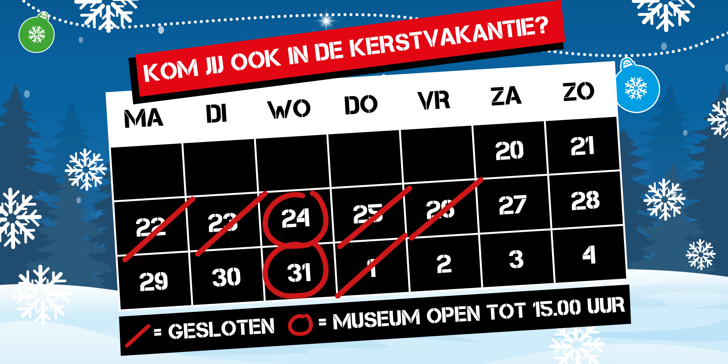 Op 24 en 31 december zijn we geopend tot 15.00 uur.
